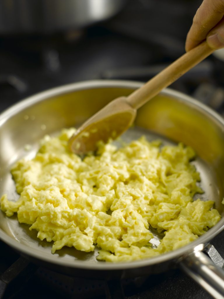 Have a good nonstick or well-seasoned cast iron pan to get evenly cooked scrambled eggs! There is nothing worst than having to scrape dried egg off the bottom of a pan.