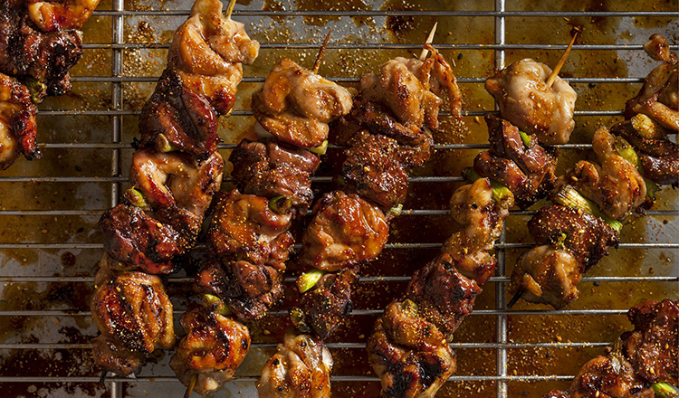 - During the last minute on the grill, brush the yakitori sauce onto the skewers and allow to caramelize slightly.