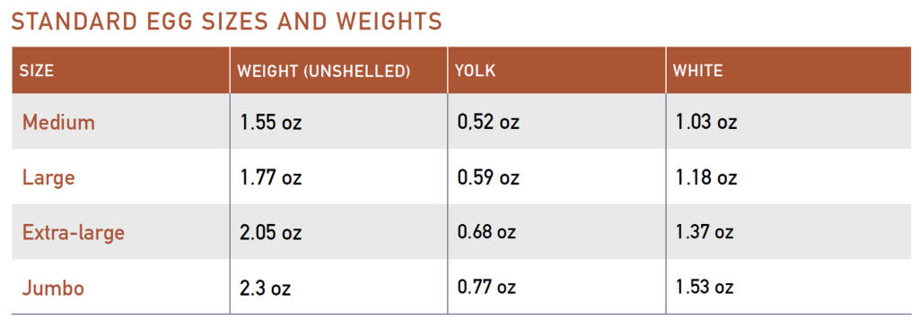 Knowing the weight of your egg can also be convenient when making large batches of recipes that call for eggs by weight. If you need 9 oz of eggs, how many eggs do you need to make this recipe? While no two eggs are exactly alike, commercial eggs are categorized by weight, so you can use these numbers as a good rough guideline.