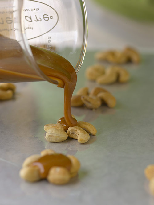 - Pour the warm caramel onto the center of each group of the nuts. Do not cover the nuts entirely, but use the caramel to bind the group together with the end of each nut protruding. Allow the caramel to cool fully to room temperature.