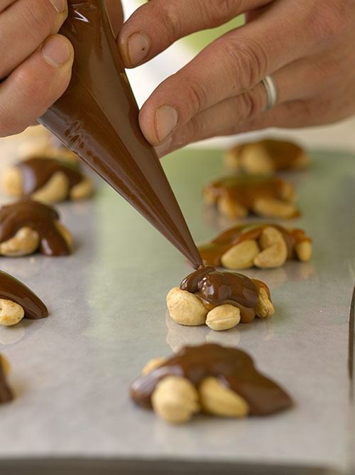 To make turtles, the nuts are placed in a cluster, the caramel is cooked and then cooled to the optimum temperature, and the chocolate is tempered and applied. Each step requires attention to detail, but the resulting turtles are well worth the effort.