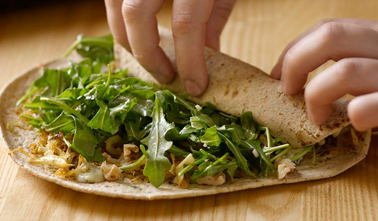 - Toss the arugula with the vinaigrette (you may not use it all). Sprinkle the scallions over the walnuts and top with the dressed arugula. Fold in the edges of the wraps and roll up like a burrito.