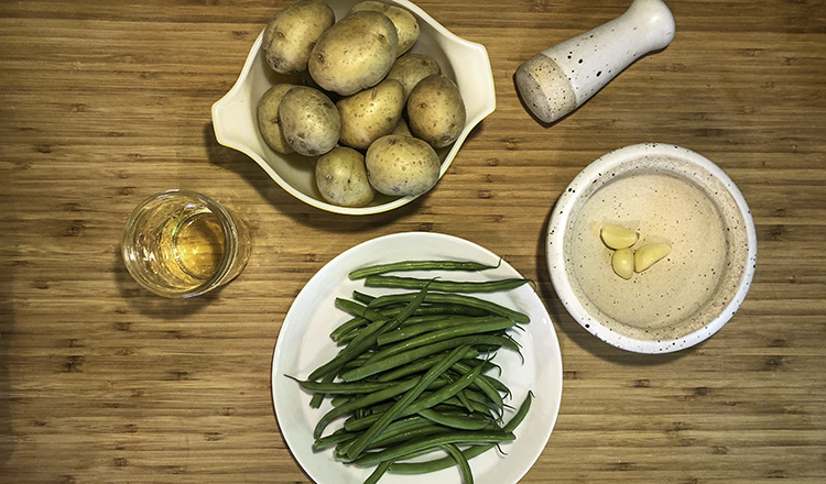 - Meanwhile, mash the garlic in a mortar and pestle with the salt and about 1/2 tsp of olive oil until a paste forms. You can also just mince the garlic or crush it on a cutting board with the side of your knife. Transfer the garlic mixture to the bowl with the green beans and potatoes.